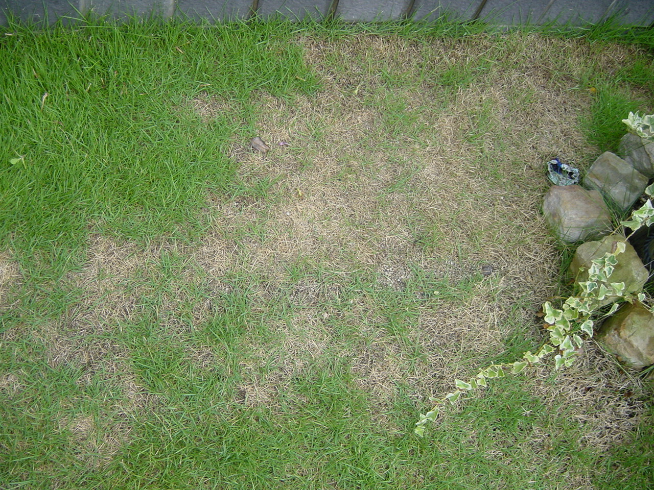 上の写真も、前回、ぼろぼろになったとした日本芝部分ですが、なにやら枯れた部分から芝目が